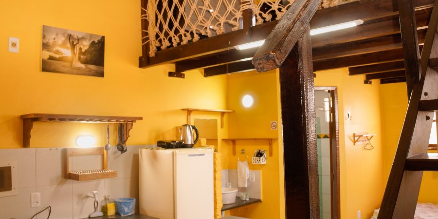 - Mini cozinha com micro-ondas e geladeira