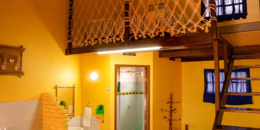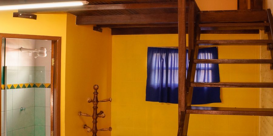 Localização: 1º andar (acesso por escada), com vista para a piscina e o jardim
